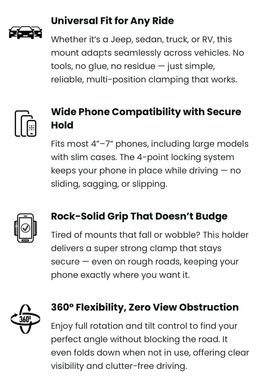 Clamp, adjust, and go with unbeatable grip, visibility, and freedom — anytime, in any vehicle.