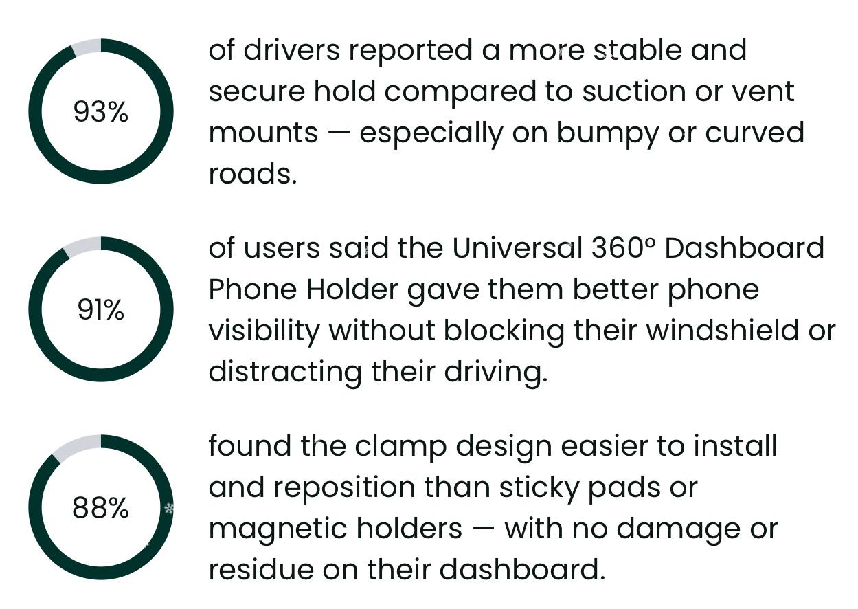 After months of customer feedback and refinement, we proudly bring you the Universal 360° Dashboard Phone Holder — the only mount designed with a powerful clamp, 360° flexibility, and no-residue installation to solve the biggest problems drivers face with traditional phone holders.